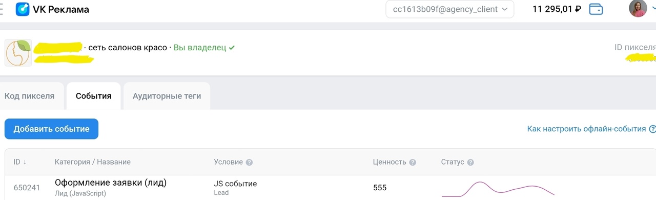 Через VK ADS было протестированы одни и те же креативы с целью на заполнение лид-форма и сайт. На лединги был установлен пиксель, созданы события «Лид».