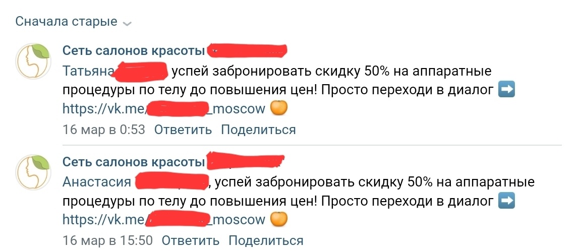 • после активации, клиентка проходила скрипт с информацией о процедурах и возможностью записаться по акции в 1 клик.
